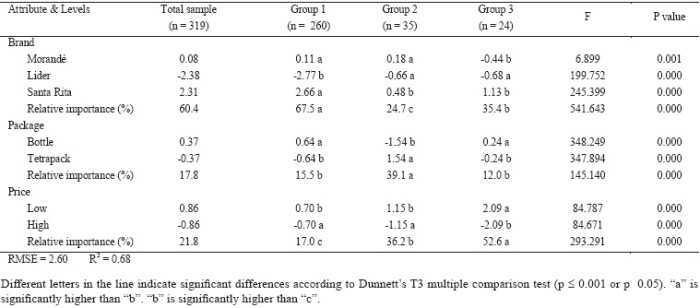 In the total sample, the results of the conjoint analysis indicate that the consumer’s choice is dominated by the brand of wine. The importance given to price (21.8%) was slightly higher than that given to packaging (17.8%). The signs of the utility of the traditional national brand and new or emerging one indicate consumer preference for these; however, the higher number corresponding to the traditional national brand (Santa Rita) indicates greater preference for it. The negative utility towards the store brand (Líder) indicates a lower preference for or rejection of it. At the same time there was evidence of a preference for bottled wine at the lowest price (Table IV).