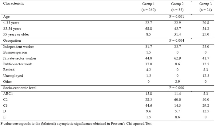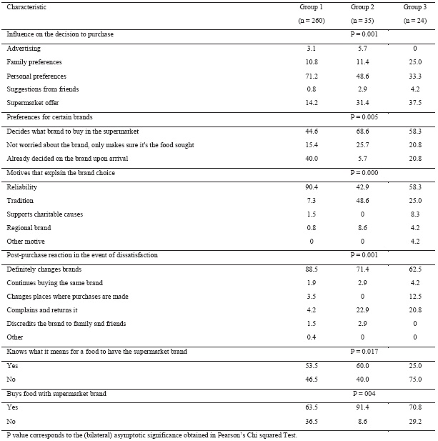 Using cluster analysis three groups of consumers could be distinguished, presenting statistically significant differences in the importance of the attributes and preferences for all attribute levels (P ≤ 0.001) (Table IV). In addition, the groups presented significant differences according to age, socioeconomic level, influences on the decision to purchase, reasons to explain brand choice, post-purchase reaction in the event of non-conformity (P ≤ 0.001), occupation, the place where it is decided that the brand will be bought, knowledge about what it means that a food has a store brand and if store-brand products are purchased regularly (P ≤ 0.05) (Tables V and VI).