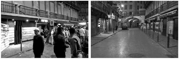 Fig. 1 Uma noite no Cais do Sodré (Lisboa) alguns meses antes da COVID-19 (esquerda), e em tempos de confinamento (direita).
