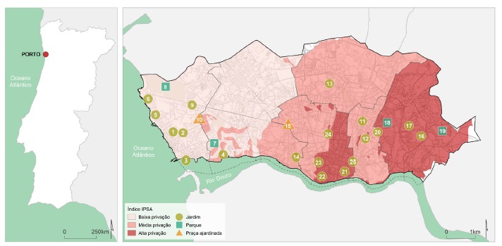 Num outro estudo realizado na cidade do Porto (Farinha Marques et al., 2014) foram identificados 95 espaços verdes de acesso público: 74 parques e jardins e 21 praças ajardinadas. Uma vez que seria incomportável estudar todos estes espaços verdes de acesso público, procedeu-se à aplicação do Índice de Privação Socioeconómica e Ambiental (IPSA; Monteiro et al., 2013) dividindo a cidade em três clusters de privação - oscilando entre privação alta e baixa -, sendo selecionados vinte e cinco espaços verdes distribuídos pelos clusters (fig. 1).