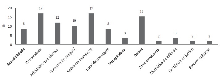 Relativamente às razões que subjazem a escolha do espaço verde que mais frequentam (fig. 6), os inquiridos indicam que a proximidade (17%) e o ambiente natural do espaço verde (17%) são os fatores mais determinantes, sendo também significativa a estética do espaço verde (15%). Por outro lado, menos peso tem o facto do espaço verde ser tranquilo (3%), a qualidade da zona envolvente (2%), o possuir memórias sobre o mesmo (3%), ter parque infantil (2%) ou a programação cultural existente (2%).