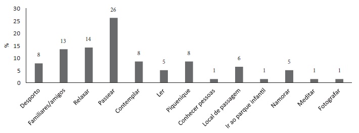 Entre as atividades mais realizadas nos espaços verdes, passear surge como a atividade com maior representatividade entre os utilizadores (26%), surgindo, de seguida, a atividade de relaxamento (14%) e a de conviver com familiares ou amigos (13%) (fig. 7). Estes resultados aproximam-se dos estudos realizados noutras cidades europeias, nomeadamente em Bragança (Fonseca et al., 2010), Amesterdão (Chiesura, 2004) e Bari (Sanesi & Chiarello, 2006). Contrariamente, conhecer pessoas, levar as crianças ao parque infantil, meditar ou fotografar surgem como as atividades menos realizadas (todas com apenas 1%), sendo corroboradas novamente pelo estudo de Fonseca e co-autores (Fonseca et al., 2010).