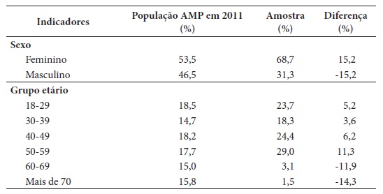 Conforme referido, os inquéritos recolhidos até ao momento (n=131) não podem ser interpretados como representativos, pelo que os resultados e conclusões devem ser lidos neste quadro de investigação. De forma a efetuar um exercício de transparência relativamente à construção da amostra, apresenta-se no quadro II uma comparação entre a população residente na AMP em 2011 (relativa ao último Censo) e a amostra atual, segundo o sexo e o grupo etário, com a respetiva diferença percentual.