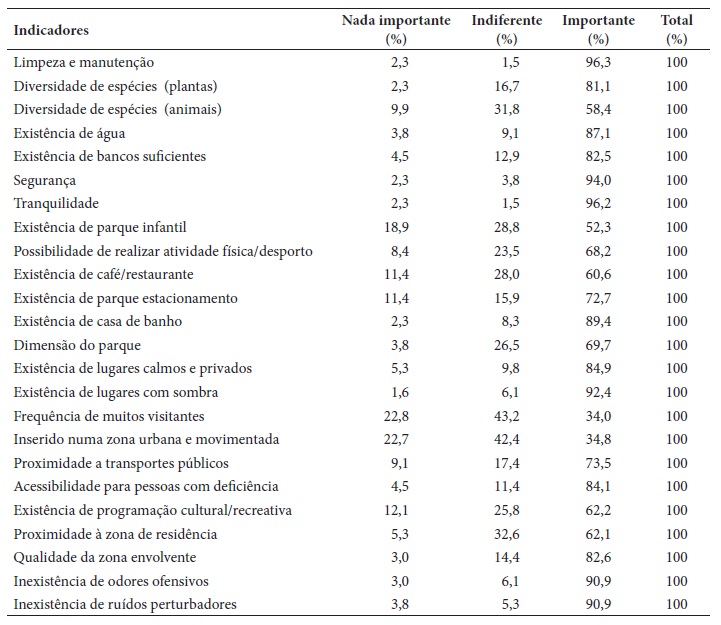 Os resultados preliminares indicam que no topo das preferências dos utilizadores se encontram os indicadores de limpeza e manutenção (96,3%), tranquilidade (96,2%), sentimento de segurança (94,0%), existência de lugares com sombra (92,4%) e inexistência de odores ofensivos e de ruídos perturbadores (90,9%). Identifica-se que a maioria das preferências se baseia na manutenção e ambiência do espaço, para além dos elementos naturais, subentendidos pela preferência de existência de lugares com sombra (densidade do arvoredo). Estes resultados são confirmados pelo estudo de Madureira et al., (2018), que identifica como elementos mais valorizados pelos utilizadores dos espaços verdes na cidade do Porto a limpeza e manutenção, diversidade de espécies de plantas, existência de elementos de água, existência de bancos e tranquilidade do espaço. Também na Áustria, o estudo de Arnberger e Eder (2015) refere a limpeza com o elemento mais valorizado pelos utilizadores dos espaços verdes. Ainda que no presente estudo, com a amostra atual, não se tenha obtido percentagens acima dos 90% para os restantes indicadores identificados no estudo de Madureira et al., (2018), a verdade é que todos eles atingiram percentagens de importância também significativas (acima dos 80%). Os indicadores menos valorizados centram-se, essencialmente, na possibilidade do espaço verde ter muitos visitantes, estar inserido numa zona urbana e movimentada e possuir parque infantil (22,8%, 22,7% e 18,9%, respetivamente, consideram como não importante).