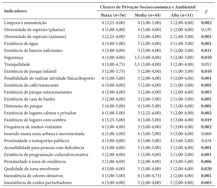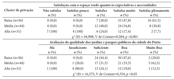 Identificou-se uma associação entre a localização dos espaços verdes, por cluster, e os respetivos graus de satisfação (χ 2 (8)= 44,908; V de Cramer=0,584; p <0,001). As avaliações referentes a “não satisfaz” e a “satisfaz pouco” aplicam-se na sua totalidade (100%) a espaços verdes localizados no cluster de alta privação socioeconómica e ambiental, o que demonstra um grau de insatisfação por parte dos seus utilizadores. Relação inversa é encontrada na avaliação de “satisfaz plenamente” que foi dada, na sua maioria (61,5 %), a espaços verdes localizados no cluster de baixa privação. Situação idêntica é observada em relação ao atributo qualidade (χ 2 (8)=16,375; V de Cramer=0,354; p <0,05), na medida em que a atribuição da avaliação de “má qualidade” refere-se a um espaço verde localizado no cluster de alta privação. Ainda assim, a avaliação de “qualidade insuficiente” é também, na sua maioria (80%), respeitante a espaços verdes localizados no mesmo cluster.
