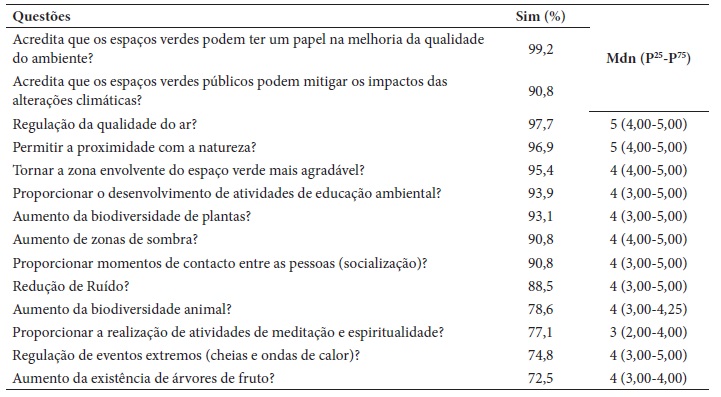 Observa-se um reconhecimento significativo dos utilizadores dos espaços verdes quanto ao papel que estes podem ter na melhoria da qualidade do ambiente nas cidades (99,2%). Situação similar ocorre na concordância de que estes espaços contribuem para a mitigação dos impactos das alterações climáticas (90,8%). No domínio dos serviços dos ecossistemas apresentados, verifica-se que mais de 70% dos respondentes (72,5 a 97,7%) reconhecem-nos. De entre os serviços apresentados, a “regulação da qualidade do ar” é reconhecida por 97,7% dos inquiridos, sendo igualmente considerado como o serviço mais importante (Mdn=4), sucedido por “permitir o contacto com a natureza” (96,9%), “tornar a zona envolvente mais agradável” (95,4%), “proporcionar atividades de educação ambiental” (93,9%), “promover o aumento de espécies de plantas” (93,1%) e de” zonas de sombra” (90,8%).