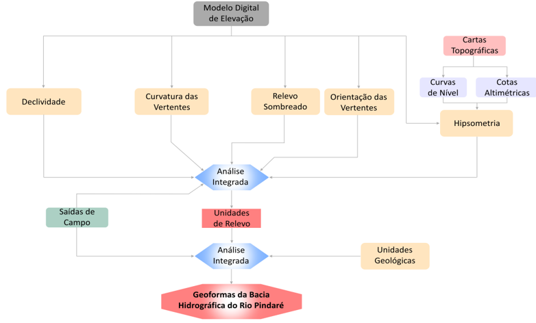 A metodologia para alcançar a proposta diz respeito à aquisição de dados secundários, a saída de campo para averiguação de tais dados e vetorização, e a proposição das geoformas e das unidades geossistêmicas (fig. 2). Para todas, o auxílio de ferramentas e técnicas do geoprocessamento foram fundamentais, em especial o software ArcGis 10.