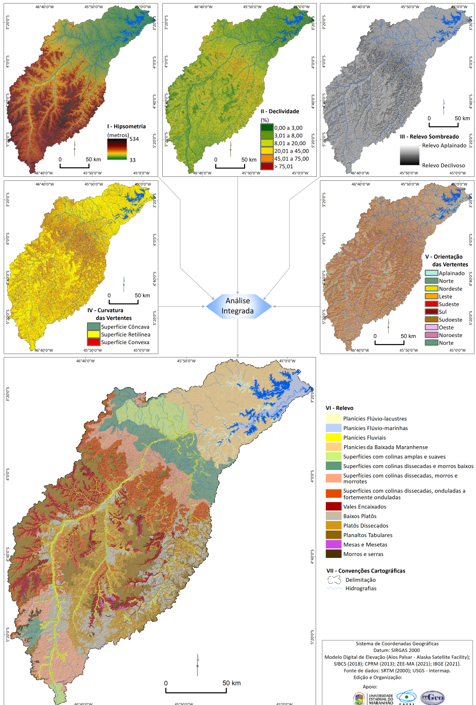 A compartimentação geomorfológica visa identificar as formas de relevo e/ou grandes domínios dependendo do nível taxonômico que se quer alcançar. Avaliar a estrutura, fatores de formação e as esculturas atuais dessas formas de relevo são fundamentais para uma proposta de compartimentação como essa, bem como, se utilizar dessas divisões territoriais para compreender a paisagem e as características que perfazem os usos e características atuais. Desse modo, identificou-se alguns padrões dessa região maranhense, analisando a declividade, hipsometria, curvatura de superfície, relevo sombreado e orientação das vertentes, para alcançar o objetivo proposto (fig. 3).