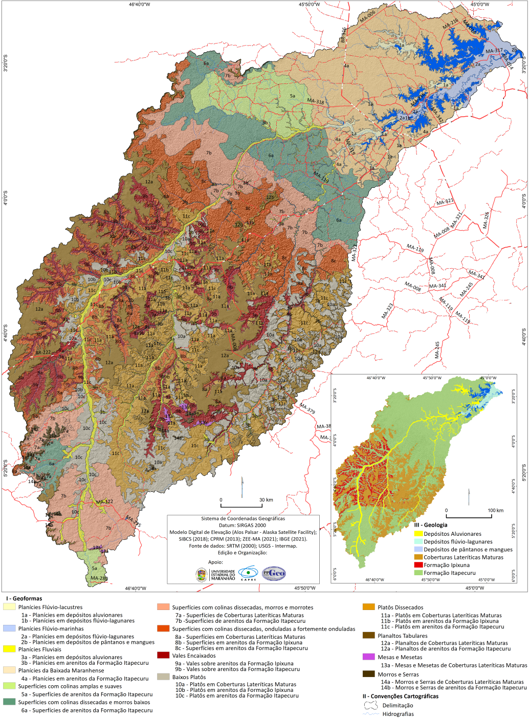 Desse modo, este trabalho objetivou avaliar as características geológicas e geomorfológicas (geoformas) para alcançar uma primeira aproximação das unidades geossistêmicas, de modo a identificar, classificar e cartografar as paisagens, com vistas a fomentar distintos ramos de aplicação do conhecimento científico em um estado que ainda carece de tais estudos. Entre esses ramos, permitir a melhoria das políticas de conservação e a gestão ambiental das bacias hidrográficas maranhenses.