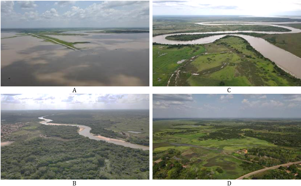 Fig. 5 Planícies do baixo curso da BHRP: A - Planícies de influência marinha, B - Planícies flúvio-lacustres, C - Planícies fluviais, D - Planície da Baixada Maranhense.