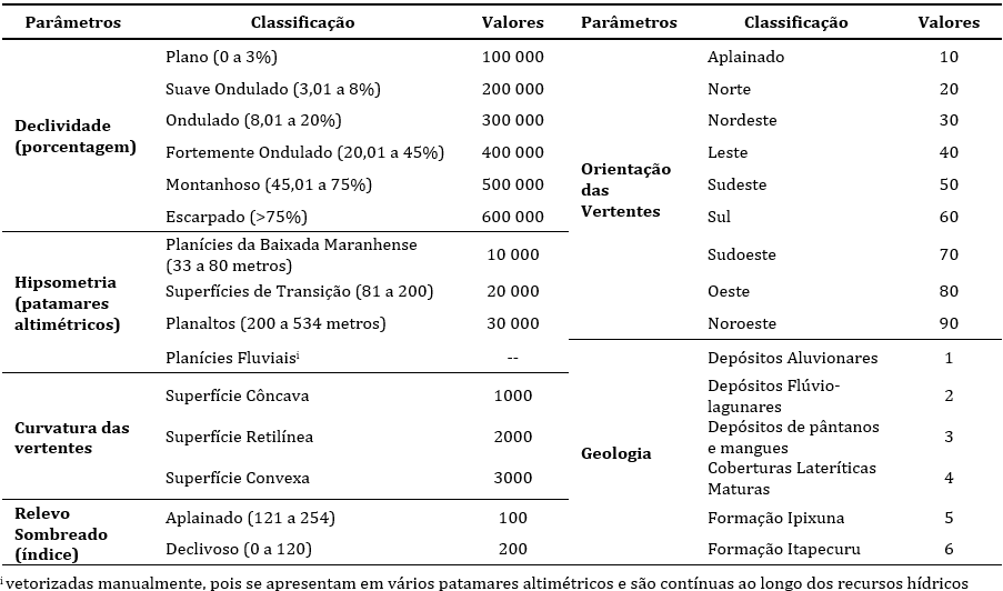 Lembrando que as ponderações foram realizadas utilizando os pesos mostrados no quadro I, os critérios realizados para cada variável foram: para a declividade (inclinação do relevo); para a hipsometria (patamar altimétrico em relação ao nível do mar); para a curvatura das vertentes (a sua superfície côncava, convexa ou retilínea); para o relevo sombreado (os índices automáticos do MDE); para a orientação das vertentes (suas direções geográficas, o que infere sobre o escoamento superficial e relevo); e para a geologia (suas formações rochosas e composições mineralógicas).