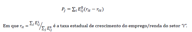 Em que “i” se refere aos setores e “j” diz respeito às regiões consideradas. O P j - efeito proporcional/estrutural - representa, de maneira geral, o volume marginal de emprego ou renda que o município “j” adquiriu entre os períodos considerados por conta da composição da sua estrutura produtiva, podendo assumir valores positivos (estrutura produtiva de setores em que o emprego/renda crescem a taxas superiores à estadual) ou valores negativos. Este efeito é dado por: