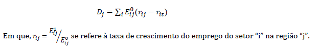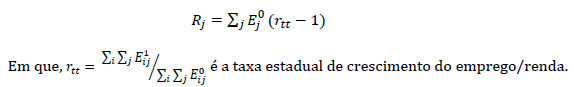 O Rj (efeito regional/diferencial) representa a taxa de crescimento hipotética, ou seja, a variação do emprego (ou da renda) no setor da região que teria acontecido se o crescimento ocorresse conforme a taxa estadual. Assim, caso a variação real for maior que a variação teórica, isso significaria que o emprego (ou renda) do setor “i” no município “j” cresceu acima da média estadual e que há elementos dinâmicos internos e/ou externos atuando na região de forma positiva. O inverso acontecerá caso a variação real seja inferior à hipotética (Viana et al., 2020). Este efeito pode ser aferido da seguinte maneira: