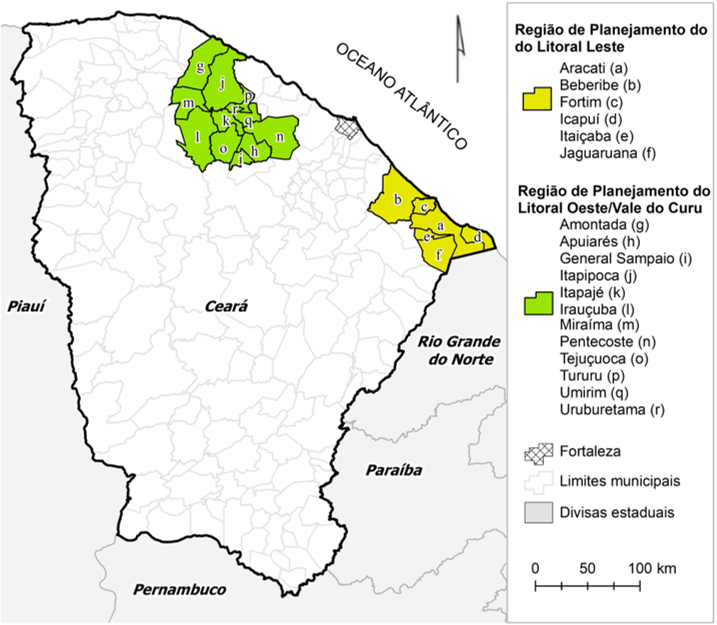O Estado do Ceará é composto por 184 municípios, divididos em 14 regiões de planejamento, dentre elas, as duas selecionadas para este trabalho (fig. 1): Região de Planejamento do Litoral Leste (Aracati, Beberibe, Fortim, Icapuí, Itaiçaba e Jaguaruana) e a Região de Planejamento do Litoral Oeste/Vale do Curu (Amontada, Apuiarés, General Sampaio, Itapipoca, Itapajé, Irauçuba, Miraíma, Pentecoste, Tejuçuoca, Tururu, Umirim e Uruburetama) (Ceará, 2019).