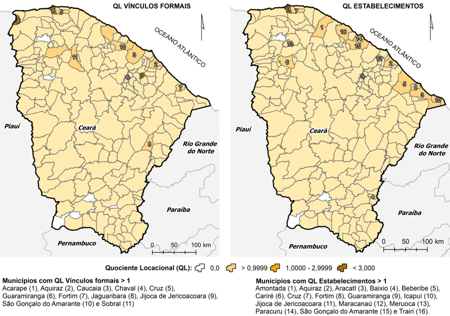 Além dessas informações, foram elaborados dois indicadores adicionais que evidenciam a (in)existência de atividades produtivas fortes nos municípios. O primeiro indicador mencionado é o Quociente Locacional (QL) para representar a especialização relativa de uma localidade em relação a um setor específico ou atividade económica. É calculado como a razão entre duas estruturas económicas: o numerador representa a "economia" em estudo (municípios selecionados), enquanto o denominador representa uma "economia de referência", que pode ser o próprio estado do Ceará, ou região Nordeste ou Brasil. Este indicador metodológico é amplamente utilizado na literatura para investigações de especialização de aglomerações de atividades económicas produtivas (Filho, 2006).