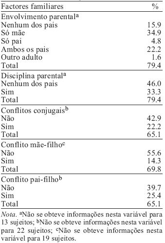 Os resultados apresentados na Tabela 1 permitem-nos observar que os pais de 22.2% dos sujeitos da amostra parecem ter conflitos conjugais manifestos (do conhecimento dos técnicos de reinserção social) e que 14.3% dos adolescentes têm uma relação com a mãe pautada por conflito, observando-se, de igual modo, em 25.4% dos casos, conflitos na relação com o pai.