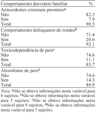 Baseando-nos em diversos estudos que indicam que o comportamento desviante familiar está significativamente associado ao comportamento anti-social na adolescência (e.g., Farrington, Jolliffe, Loeber, Stouthamer-Loeber, & Kalb, 2001; Wasserman & Seracini, 2001), foi nossa intenção avaliar a incidência deste factor de risco nos adolescentes em estudo. Ao contrário do que esperávamos, a ocorrência das diversas variáveis que utilizámos para descrever o comportamento desviante familiar é baixa, conforme podemos observar na Tabela 2.