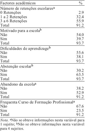 Tentámos ainda perceber se existe envolvimento social e escolar/profissional do adolescente, tendo sido considerados como indicadores de risco para comportamento delinquente, o número de retenções escolares, a existência de dificuldades de aprendizagem, a abstenção escolar e o abandono escolar. Como factores protectores de comportamento delinquente atendemos à existência de motivação para a escola. No que diz respeito aos indicadores do desempenho académico, os resultados obtidos apontam para problemas académicos numa percentagem relevante de sujeitos: 55.9% reprovou entre três a seis vezes e 54.0% não se encontrava motivado para a escola. Do mesmo modo, a abstenção escolar era elevada (63.7%), 52.9% dos adolescentes tinham abandonado os estudos e apenas uma percentagem relativamente baixa de adolescentes (23.5%) se encontrava a frequentar cursos de formação profissional (Tabela 3).