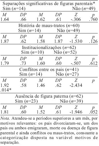 Para analisarmos eventuais diferenças entre os grupos em função da existência de acontecimentos negativos na infância, utilizámos o teste de Mann-Whitney. Foram considerados como indicadores de acontecimentos negativos na infância: separações das figuras parentais, história de maus-tratos, institucionalizações, conflitos entre os pais e ausência de figura paterna no agregado familiar (Tabela 4).