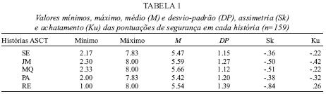 A caracterização descritiva das pontuações de segurança atribuídas ao desempenho dos sujeitos, em cada história, é dada na Tabela 1.