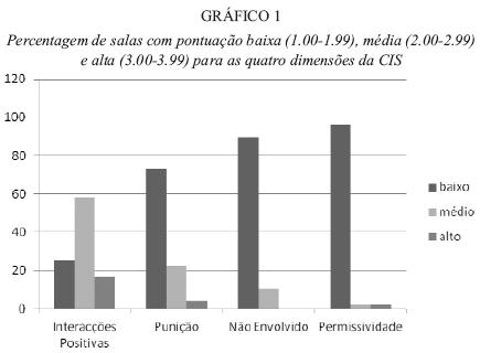 De modo a melhor caracterizar as interacções que os professores estabelecem de acordo com as dimensões da CIS, apresentamos ainda no Gráfico 1 as percentagens de salas em que o professor recebeu uma cotação baixa, média ou elevada. Como se pode ver, a maioria dos professores (cerca de 60%) tende a estabelecer relações moderadamente positivas com os seus alunos. A grande maioria dos professores (mais de 70%) tende a obter valores extremamente baixos nas restantes dimensões, mostrando que os professores do 1.º ano de escolaridade não desenvolvem interacções inadequadas punitivas (73%), nem permissivas (96.5%) e permanecem altamente envolvidos com as crianças (89.6%).