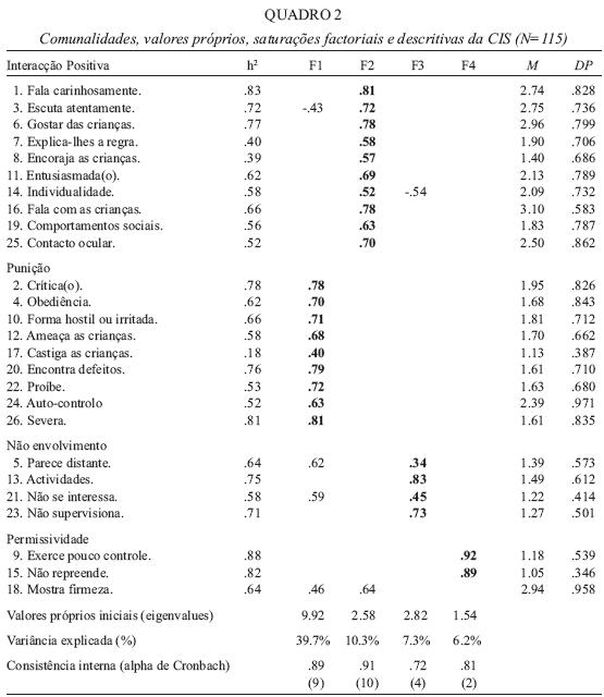 Foi conduzida uma análise factorial exploratória, com o recurso ao método de extracção das componentes principais com rotação varimax. Os pressupostos estavam cumpridos (KMO=.83; teste de esfericidade de Bartlett, p<.01). A partir da scree plot, e tendo em conta a versão original, forçámos a extracção de 4 factores (25 itens)4. No Quadro 2 apresentamos a solução encontrada, assim como os valores de comunalidade e a saturação factorial para cada item e ainda os valores próprios encontrados.