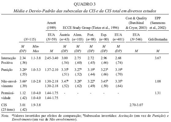No Quadro 3, são apresentados as médias e desvios-padrão para as quatro dimensões. Os valores obtidos vão de encontro ao esperado, sendo as médias mais elevadas na subescala Interacção Positiva e as médias mais baixas nas restantes três subescalas, que denotam interacções desadequadas para o desenvolvimento. São ainda apresentados a média e o desvio-padrão para a escala total, tendo-se invertido, para o seu cálculo, os itens de três subescalas, de modo a que a nota global corresponda a uma nota positiva. A média do total da escala foi de 3.01 (DP=0.42), o que significa que os professores, em média, tendem a estabelecer interacções moderadamente positivas com as crianças. Estas interacções apresentam um elevado nível de envolvimento e tendem a não ser punitivas nem permissivas. No Quadro 3, são também apresentados os valores obtidos com a CIS em outros estudos, sendo no entanto importante salientar que ao longo dos estudos, os itens incluídos em cada subescala variam ligeiramente, pelo que a comparação entre os valores merece algum cuidado. Salientamos, apenas, que os valores são próximos nos vários estudos, com uma tendência para a existência de relações próximas, positivas e aceitantes.