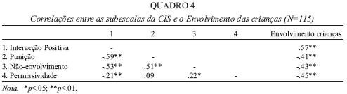 No Quadro 4 são apresentadas as correlações entre as quatro subescalas. As associações entre as subescalas vão no sentido esperado, com correlações negativas entre a subescala Interacção Positiva, por um lado e as restantes subescalas Punição, Não-envolvimento e Permissividade, por outro. As associações são moderadas, com a excepção das associações entre a Permissividade e as restantes subescalas, essencialmente fracas, o que se pode compreender tendo em consideração a baixa variabilidade desta dimensão.