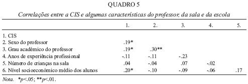 Por último, analisámos as possíveis relações entre a CIS e algumas características do professor, da sala e dos alunos. Os resultados são apresentados no Quadro 5. Verifica-se que os professores do sexo feminino tendem a obter uma nota global da CIS mais elevada, r(115)=.19. A qualidade das interacções está ainda positivamente associada ao grau académico do professor, r(113)=.19, o que significa que os professores tendem a desenvolver interacções mais positivas quando possuem uma pós-graduação ou um mestrado. Os resultados mostraram ainda uma associação entre a nota global da CIS o nível socioeconómico médio dos alunos, r(109)=.20. A qualidade das interacções parece ser mais elevada em salas maioritariamente frequentadas por crianças de nível socioeconómico mais elevado.