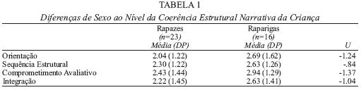 As crianças começam a utilizar os componentes da estrutura narrativa por volta dos 3 anos, atingindo a mestria na maior parte das estruturas morfo-sintáticas entre os 4 e os 5 anos (Reilly, Bates, & Marchman, 1998). No entanto, as crianças nestas idades evidenciam ainda muitas dificuldades aquando do ato narrativo, sobretudo quando não têm acesso a suporte externo, conforme Freitas (2005) verificou no seu estudo sobre o desenvolvimento narrativo da infância junto de uma amostra de 122 crianças, com idades compreendidas entre os 3 e os 10 anos de idade. O autor utilizou o mesmo instrumento de recolha e análise de dados empregues no presente estudo, mas com o seguinte procedimento: a criança conta a história do livro ao adulto (investigador) e este não pode intervir de forma a auxiliar na construção narrativa. Apesar de Freitas (2005) não ter encontrado diferenças entre os rapazes e as raparigas ao nível da coerência estrutural narrativa, alguns estudos demonstram que as narrativas das raparigas tendem a ser mais coerentes que a dos rapazes (e.g., Buckner & Fivush, 1998; Fivush, Haden, & Adam, 1995; Peterson & Roberts, 2003) e que as mães tendem a encorajar e a estimular verbalmente mais os filhos do que as filhas (e.g., Karrass, Braungart-Rieker, Mullins, & Lefever, 2002; Weitzman, Birns, & Friend, 1985). Como as raparigas tendem a obter scores mais elevados ao nível da aptidão verbal em comparação com os rapazes, estes provavelmente irão precisam de um suporte linguístico maior que o das raparigas (Faughn, 2003).