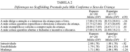 A duração da tarefa variou entre os 159 e os 786 segundos, com uma média de 408.54 segundos, DP=49.66, não se tendo verificado diferenças de sexo, t(39)=-1.08, p=.29. A duração média da tarefa não se mostrou associada à qualidade das narrativas, rs=.04, p=.82, avaliada através do resultado global da coerência estrutural narrativa, M=29.74, DP=25.39. Não se observaram diferenças estatisticamente significativas entre as crianças do sexo masculino e as do sexo feminino ao nível das sub-dimensões da coerência estrutural da narrativa (cf. Tabela 1). Também não se encontraram diferenças significativas entre rapazes e raparigas relativamente ao scaffolding prestado pela mãe (cf. Tabela 2).