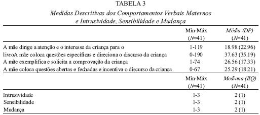 Observou-se que as mães utilizam, em média, mais questões específicas que direccionam o discurso da criança para determinados pontos-chave da história. O segundo comportamento verbal mais utilizado é o uso de exemplos e de solicitações de comprovação por parte da criança. Segue-se as questões abertas e fechadas e o incentivo do discurso da criança e, por último, os comportamentos utilizados na tentativa de dirigir a atenção e o interesse da criança para o livro (cf. Tabela 3). Relativamente ao modo como as mães guiam a construção narrativa, verificou-se que 70.8% das mães apresentam entre pouca ou alguma intrusividade, 73.2% demonstram pouca ou alguma sensibilidade e 68.3% mostram pouca ou alguma mudança.