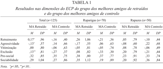 Atendendo à literatura anteriormente revista, hipotetiza-se que, ao nível da relação com o grupo de pares, os jovens socialmente retraídos serão descritos pelos seus pares como sendo mais retraídos, excluídos e vitimizados do que os seus colegas do grupo de comparação.