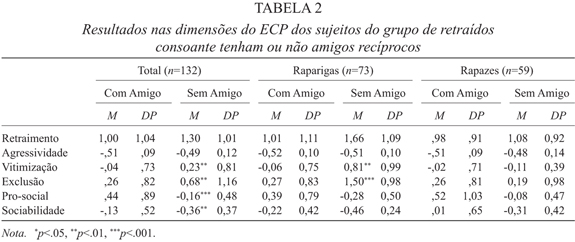 Encontraram-se efeitos de grupo significativos [F(5,123)=3.91, p<.01; Wilks’ λ=.84, ε²=.16], com ANOVAs de follow-up que demonstraram que os sujeitos retraídos sem amigos recíprocos são descritos pelos seus pares como mais excluídos [F(1,128)=11.58, p<.01; ε²=.08] e vitimizados [F(1,128)=7.59, p<.01; ε²=.06], mas também menos prosociais [F(1,128)=17.10, p<.001; ε²=.12] e sociáveis [F(1,128)=9.13, p<.01; ε²=.07]. Verificou-se, igualmente, uma tendência para que estes adolescentes retraídos sejam ainda vistos como mais retraídos [F(1,128)=3.46, p=.06, ns].