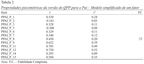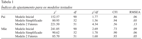 Seguidamente, o modelo unifatorial do QPP, segundo Palkovitz (1984), foi ajustado a uma amostra de 200 questionários de pais e 200 questionários de mães. O modelo inicial para o pai revelou uma qualidade de ajustamento moderado; o modelo para a mãe revelou uma qualidade de ajustamento pobre. Os índices dos modelos podem ser analisados na Tabela 1.