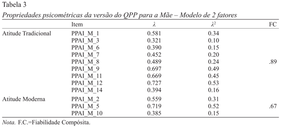 Assim foi especificado um novo modelo para as mães, composto por dois fatores, dividindo os itens respeitantes a uma “atitude tradicional face ao papel do pai” num fator e os itens respeitantes a uma “atitude moderna” noutro fator. Verificou-se que o item 10 tinha um peso fatorial estandardizado de λ=.38 no fator “Atitude Tradicional”, pelo que foi incluído neste modelo. Por outro lado, o item 15 (“Considerando todos os aspetos da paternidade, ser pai é uma experiência extremamente gratificante”) demonstrou um índice de modificação superior a .11 para a inclusão nos dois fatores, pelo que o eliminámos. Este modelo de 2 fatores para a mãe demonstrou um bom ajustamento. Para efeitos comparativos foi, também, calculado para o pai um modelo de dois fatores, homólogo ao da mãe, que veio a demonstrar um ajustamento muito pobre (ver Tabela 1).