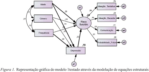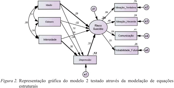 O modelo de equações estruturais 1 (veja-se Figura 1) ajusta-se aos dados de forma satisfatória [χ2(14)=527.83, p<.003, χ2/df=1.99, CFI=0.94, SRMR=0.051, RMSEA=0.078]. Este modelo explica 24% da variância do risco suicidário. O modelo 2 (veja-se Figura 2) também se ajusta aos dados de forma satisfatória [χ2(26)=50.13, p<.003, χ2/df=1.928, CFI=0.96, SRMR=0.052, RMSEA=0.075]. O modelo 2 explica igualmente 24% da variância do risco suicidário.