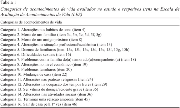 Escala de Avaliação de Acontecimentos de Vida (LES). A LES foi uma escala desenvolvida por Sarason et al. (1978) para avaliar a perceção que os indivíduos têm relativamente a um conjunto de acontecimentos de vida. A LES apresenta a mais-valia de não atribuir conotação positiva ou negativa aos acontecimentos de vida. Em vez disso, é o sujeito que a valia o impacto mais ou menos negativo ou positivo que tem de cada um dos acontecimentos que correspondem aos itens que a constituem (Sarason et al., 1978). Na versão original os itens podem ser respondidos numa escala de 7 pontos que vai desde o Muito negativo (-3 pontos) ao Muito positivo (3 pontos). Para além destas 7 opções de resposta, na versão portuguesa foi introduzida uma opção, não pontuável (Não se aplica), que permite distinguir acontecimentos que o indivíduo de facto não experimentou das respostas omissas (Silva, Pais-Ribeiro, Cardoso, & Ramos, 2003). No presente estudo considerou-se apenas um conjunto de 16 categorias de acontecimentos de vida/itens (veja-se Tabela 1) dos quarenta e sete elencados na LES, que a literatura (e.g., Cheng, Chen, Chen, & Jenkins, 2000; Fergusson et al., 2000; Heikkinen et al., 1994; McAuliffe et al., 2003) tem identificado como estando associados ao risco de suicídio. Em termos psicométricos, a escala de acontecimentos de vida cotados como negativos apresenta uma consistência interna de .70 (Sarason et al., 1978; Silva et al., 2003), considerada razoável (Almeida & Freire, 2003; Pestana & Gageiro, 2008). No presente estudo, obteve-se um alfa de Cronbach de .66. Utilizaram-se dois índices, um relativo à frequência de acontecimento de vida percebidos como negativos (número dos 16 acontecimentos de vida identificados pelo indivíduo como tendo um impacto negativo) e intensidade (média da pontuação nos itens identificados pelo indivíduo como tendo um impacto negativo).