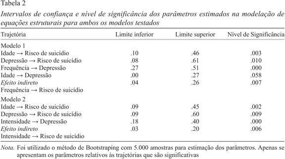 No modelo 1, que testou o efeito da frequência de acontecimentos de vida percebidos como negativos no risco de suicídio, e de acordo com a Tabela 2, verifica-se que a idade se relacionou de forma direta e significativa com o risco suicidário, bem como a depressão. A frequência de acontecimentos de vida percebidos como negativos também se relacionou de forma direta com a depressão. A idade tendeu a relacionar-se de forma significativa com a depressão. Finalmente a frequência de acontecimentos de vida negativos relacionou-se de forma indireta com o risco suicidário. Dado que a frequência de acontecimentos de vida percebidos como negativos se relaciona indirectamente de forma significativa com o risco se suicido, mas não de forma directa, apesar de apresentar uma relação directa significativa quando o modelo é testado sem a variável mediadora depressão (β=.17, p<.05), conclui-se que a depressão medeia a relação entre acontecimentos de vida e risco de suicídio.