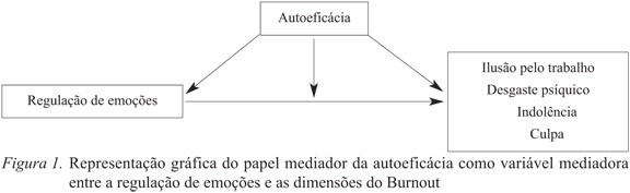 A autoeficácia, na perspectiva de Bandura (1977, 2012), é o conjunto de crenças que a pessoa tem sobre a sua capacidade para organizar e executar as ações necessárias para produzir determinadas metas ou objectivos. Avaliada na sua forma especifica, este conceito refere-se essencialmente às crenças sobre a capacidade de lidar com tarefas e exigências do trabalho, com seus desafios ou ainda com o stress relacionado com o trabalho e as suas consequências. Nessa perspectiva, esta estudo baseia-se no modelo apresentado na Figura 1, pelo qual a autoeficácia desempenha papel mediador na relação entre a regulação de emoções e as dimensões de Burnout.
