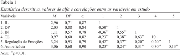 Na Tabela 1 são apresentas as médias, o desvio padrão, valores de alfa e matriz de correlação entre as variáveis em estudo. Os resultados evidenciam uma média mais elevada na dimensão de Burnout de Ilusão pelo trabalho e inferior na dimensão de Indolência. Os instrumentos utilizados revelam índices adequados de consistência interna, avaliados pelo alfa de Cronbach (Bland & Altman, 1997), apresentando uma variação de 0,78 a 0,90. As variáveis apresentam correlações que variam de fracas (r=0,13) a moderadas (r=0,63).