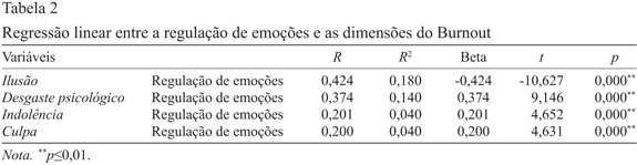 Na Tabela 2, apresenta-se o resultado da regressão entre a regulação de emoções e as dimensões do Burnout, sendo confirmada a primeirahipótese. Os resultados evidenciam que a regulação de emoções prediz significativamente e de forma positiva, as dimensões Desgaste psicológico, Indolência e Culpa; e de forma negativa, a dimensão Ilusão pelo trabalho, com um tamanho do efeito que varia de pequeno (0,040) a médio (0,180).