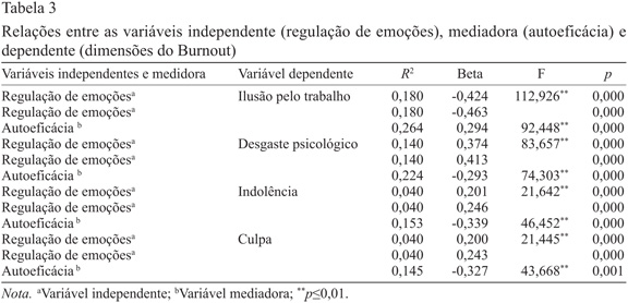 Por fim, a terceira condição afirma que, na presença da variável independente e do mediador, a relação significativa que existia entre a variável independente e a dependente decresce em magnitude. A Tabela 3 apresenta o teste de mediação para a variável independente regulação de emoções. Os resultados indicam que, na presença da variável autoeficácia, a relação entre a regulação de emoções e as dimensões do Burnout decrescem em magnitude (Beta diminui) e o poder explicativo das dimensões do Burnout aumenta (R2 aumenta), ou seja, há relação de mediação, confirmando a segunda hipótese do estudo.