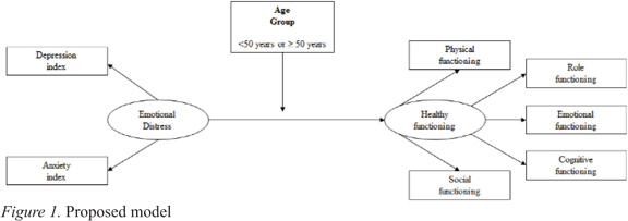 To test our second and third hypotheses, we conducted a preliminary correlational analysis and it was necessary to adjust the hypothesized overall model. When we analyze the relationship between emotional distress and functional scales of HRQOL, we found that anxiety was not associated with most of the scales in the <50 years group and was therefore not included in the model. This is in line with the literature that reports, more recurrently, associations between depression and quality of life (Montazeri, 2008) within this setting.