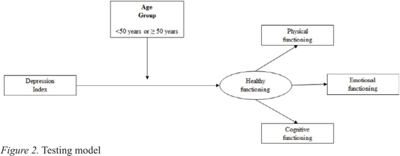 We also verified that not all functional scales showed a significant association with depression in both groups, for example: depression was negatively associated with role functioning in the older group, but not for the <50 years group; and a negative relationship between depression and social functioning was found in the younger group, but not in the ≥50 years group. This result seemed to point to some age-specific variations in the relationship between depression and HRQOL, which should be explored later. However, the association between depression and functional indicators such as cognitive, emotional and physical functioning was consensual in both groups. Based on the result of this analysis, the tested model explored the unique effect of depression on a latent variable integrating the three functional scales.