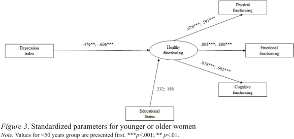 Considering the equally constrained model on the paths from depression symptoms to healthy functioning, the model fit was invariant for women <50 years and ≥50 years. The fit indexes were slightly better [χ2(12)=16.97, p=.151; CFI=.97; RMSEA=.06] in the equality constrained model, but the difference between models was not significant [χ2(4)=2.01, p>.05] indicating that age group did not moderate this relationship. However, for women <50 years, the model accounted for 32% (.324) of variance in healthy functioning and for women ≥50 years 51% (.513) of variance of this predictive variable.