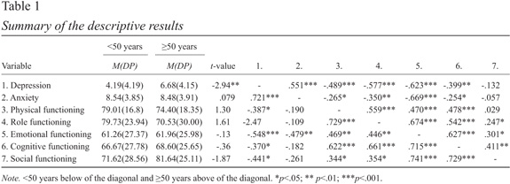 Results indicate that the ≥50 years group presented higher scores in HADS-D than the younger group as shown in Table 1. Bivariate analysis for the two age groups showed that in both groups, depression was associated with functional scales such as physical functioning, emotional functioning and cognitive functioning. In the ≥50 years group, but not in the younger group, a strong association was found between depression and the role functioning scale. In the <50 years group, anxiety was only associated with emotional functioning. Regarding the older age group, this variable was associated with physical functioning, role functioning, emotional functioning and cognitive functioning. All functional scales were inter-correlated in both groups (r>.40, p<.01), with the exception of the social functioning scale, which was not associated with physical functioning in the ≥50 years group (see Table 1).