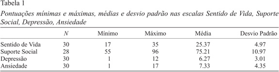 Na Tabela 1 encontram-se as pontuações mínimas e máximas obtidas pela totalidade da amostra na Escala de Sentido de Vida, na Escala de Suporte Social e nas escalas de Depressão e Ansiedade da HADS. Apresenta-se, ainda, a média obtida para cada escala, assim como o respetivo desvio padrão.