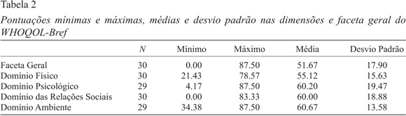 Em relação à Qualidade de Vida, variável resultado desta investigação, apresentam-se na Tabela 2 as pontuações mínimas e máximas obtidas em cada uma das dimensões do WHOQOL-Bref e na faceta Geral, bem como as respetivas médias e desvios padrão.
