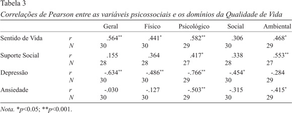 Na Tabela 3 encontram-se as correlações entre as variáveis psicossociais do estudo e a variável dependente (Qualidade de Vida).